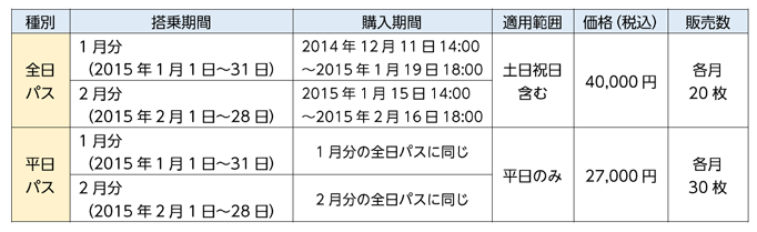 1月分(有効期間:2015年1月1日~1月31日)と2月分(有効期間:2015年2月1日~2月28日)の2ヶ月分のみ発行。購入は1ヶ月ごと、枚数が限られているため先着順になるそうです。