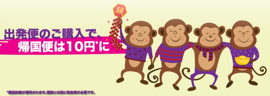 【帰国便10円】出発便の購入で帰国便は10円に。香港エクスプレス 投稿日時: 2016/02/04 投稿者: 与太郎 香港エクスプレスから、『帰国便10円』のご案内。本日4日までの限定販売です。 キャンペーン概要 販売期間 : ~2016年2月4日搭乗期間 : 2016年2月9日~2016年12月15日まで対象路線 : 東京・大阪・名古屋・福岡・広島販売座席数 : 44,000席以上 お申込&キャンペーン詳細は↓から 『帰国便10円』 良い旅を。 Pocket 関連する記事: 【片道3,500円~】72時間限定・直前割引セール!!香港エクスプレス 【片道10円~】クリスマスメガセール開催!!香港エクスプレス 【片道850円~】成田・羽田・関西・名古屋・福岡から香港行き。「旧正月メガセール」香港エクスプレス 【50%割引】関西、成田、羽田、福岡、名古屋から香港行き運賃50%割引。香港エクスプレス 【片道1,300円から】成田、羽田発香港線「クリスマスメガセール」香港エクスプレス
